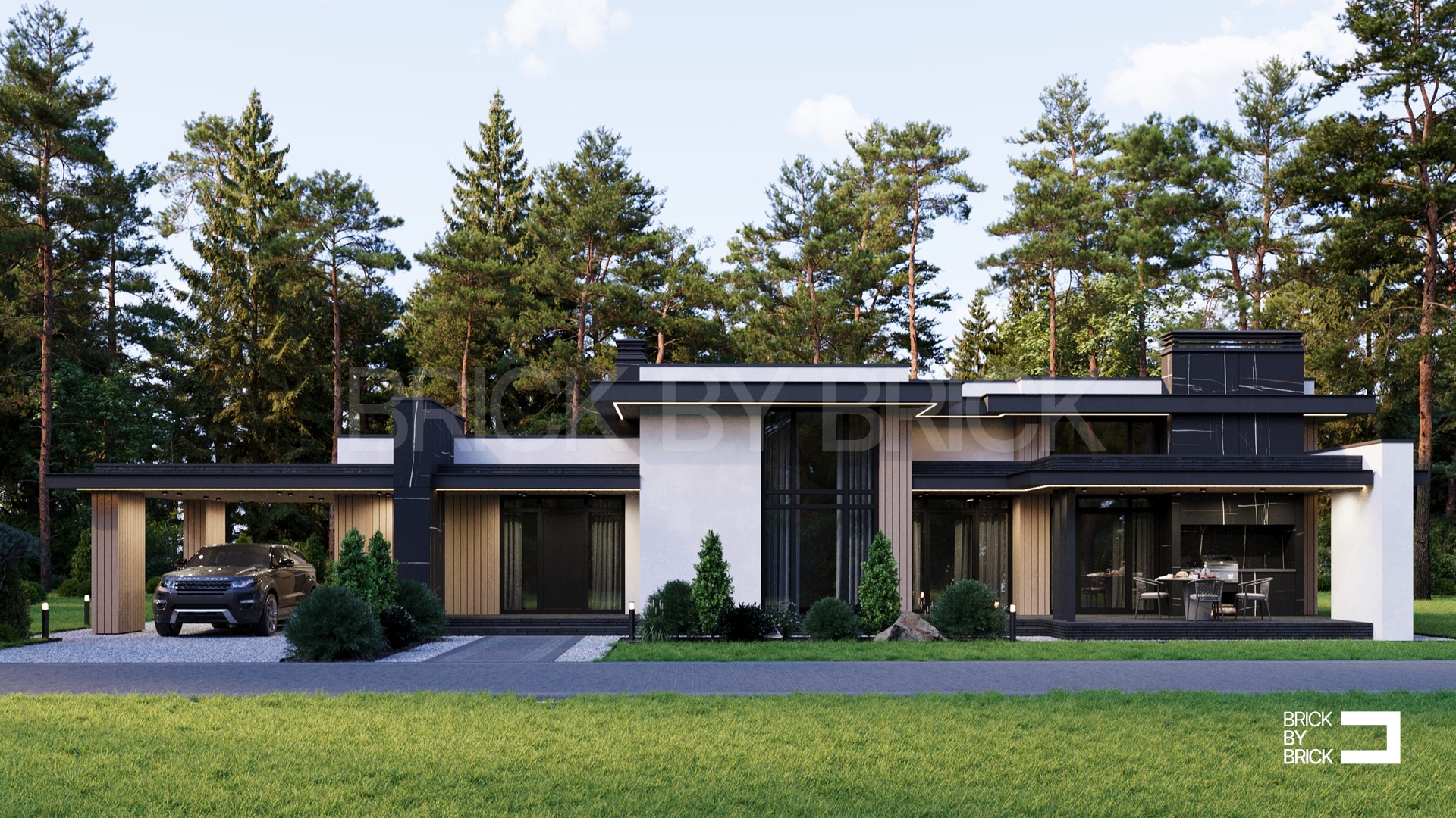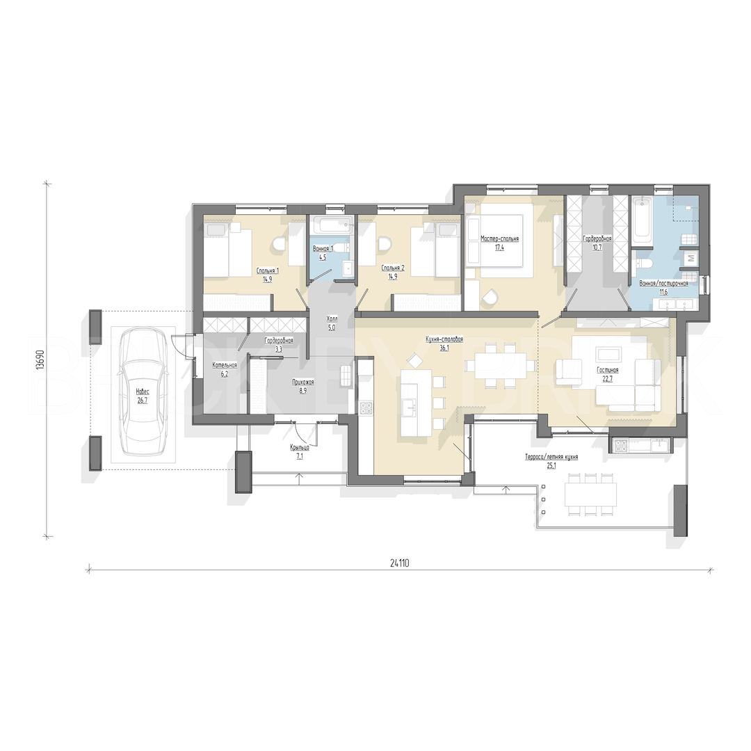 Тёплый контур дома в тёмном или светлом исполнении отделки, как на визуализации в проекте с подшивкой свесов кровли, водосточной системой, отмосткой по периметру всего дома и ливневой канализацией с своим колодцем.