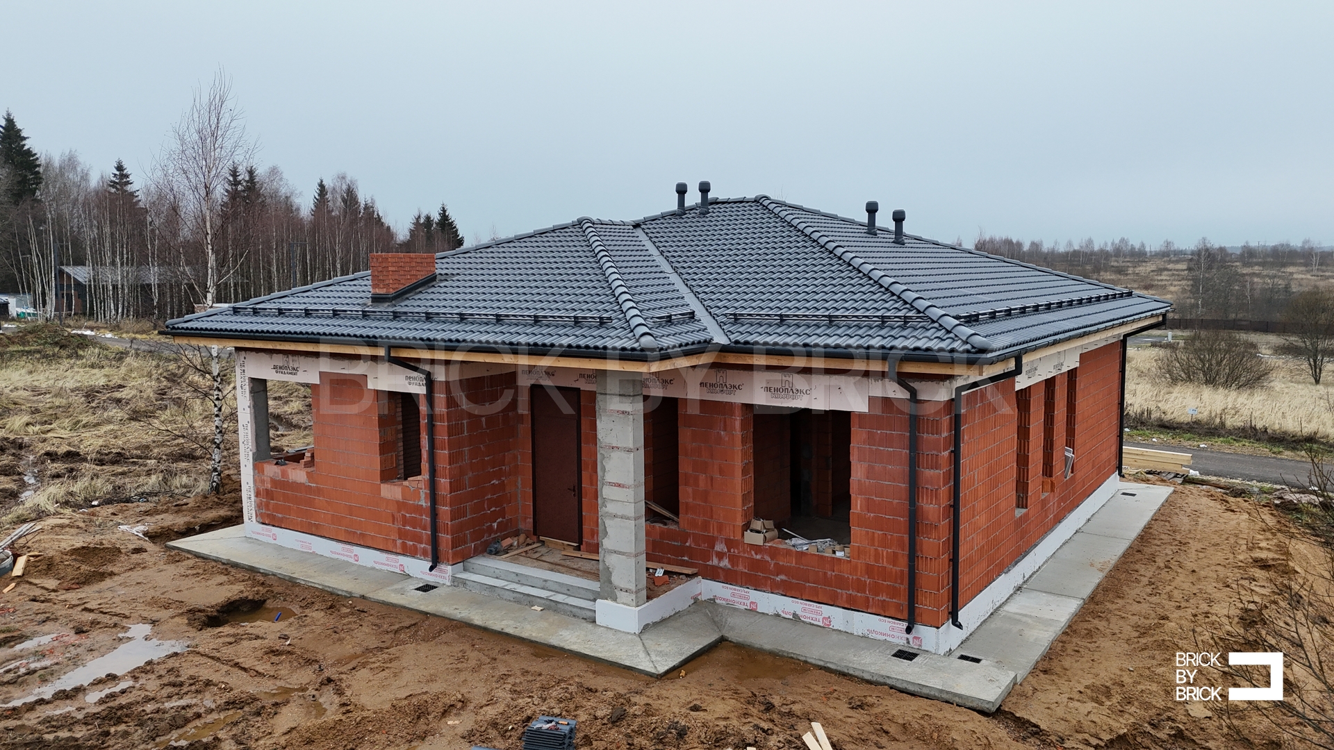Закрытый тёплый контур с внешними стенами из блоков Porotherm 38 Thermo, тёплую крышу с покрытием металлочерепицей или гибкой черепицей и утепленную железобетонную фундаментную плиту. Дом готов к внутренней и внешней отделке.